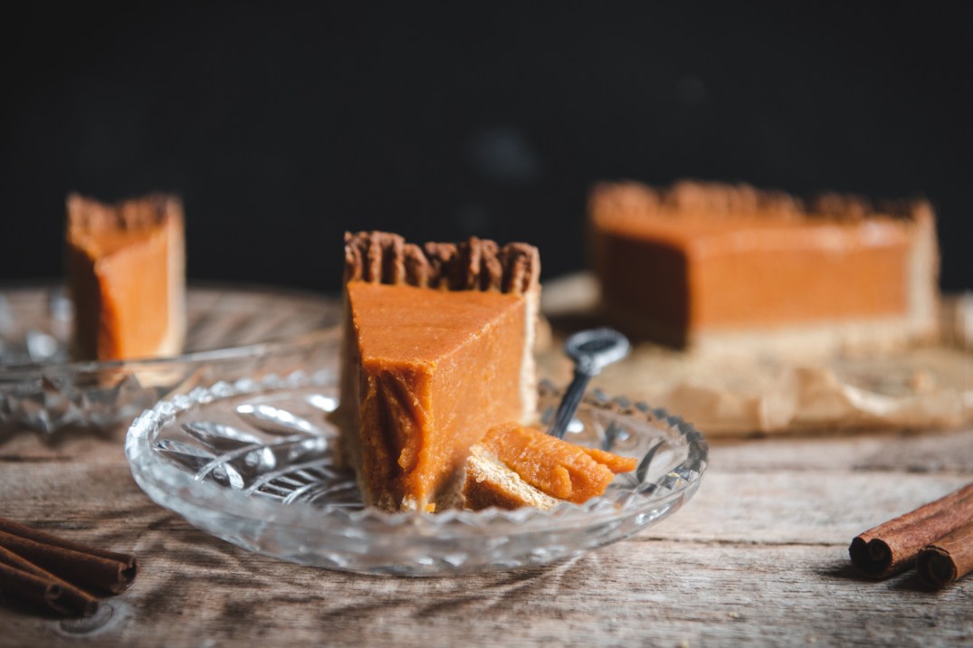 - A töltelékhez az összes hozzávalót (800 g sütőtökpürét, 400 ml zsíros (konzerves) kókusztejet, 200 g finomítatlan nádcukrot, 70 g kukoricakeményítőt, 4 db tojássárgáját (ha használunk), 2 tk. vaníliaaromát, 3/4 tk. mézeskalács fűszerkeveréket, 1 tk. őrölt fahéjat és 1 tk. sót) egyneművé varázsoljuk egy konyhai robotgépben, majd a tortaformába, az előkészített pitetésztára öntjük.