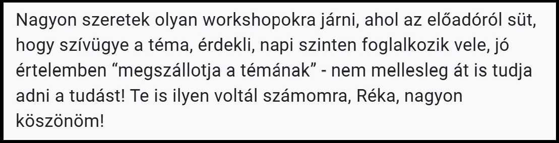 Közösségformáló, edukatív szemlélettel terveztem meg ezt a workshopot, bízom benne, hogy sokat tudsz majd tanulni és inspirálódni az elhangzottakból.